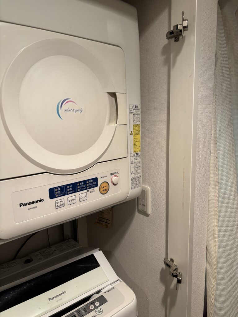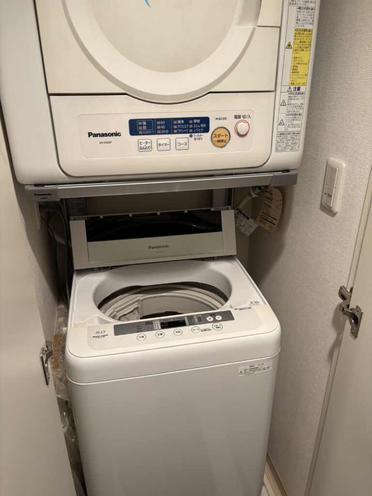 特に洗濯機と乾燥機が上下に設置されている場合、連結部分の解体や重量物の慎重な積み下ろし作業が必要となり、一般の方や不慣れな業者が行うと、狭い脱衣所の壁や床を傷つけてしまうリスクが非常に高い状態でした💦
