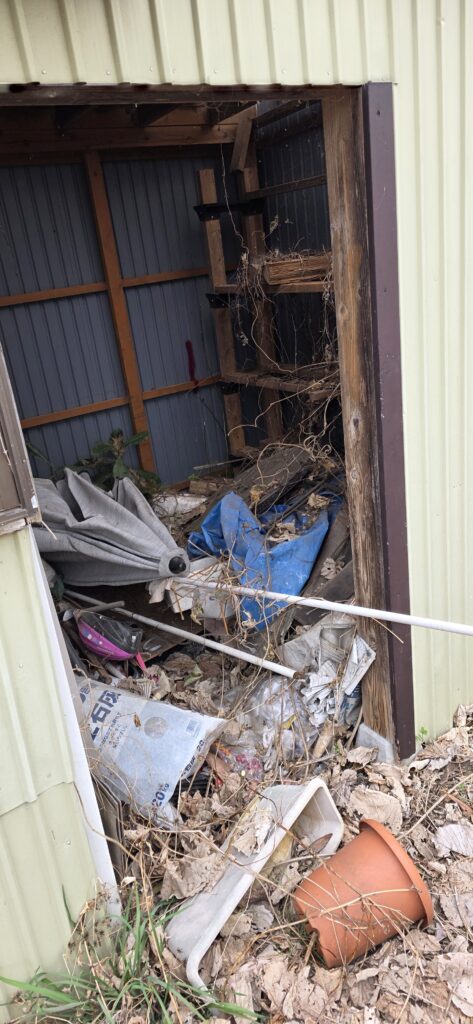 そして屋外の倉庫・小屋・物置には、廃材、雑貨、プランター、容器、長尺パイプ、木片、ツルの絡まった残置物、肥料類、工具類などが大量に残っており、まさに一時多量ゴミ状態でした📸🌱