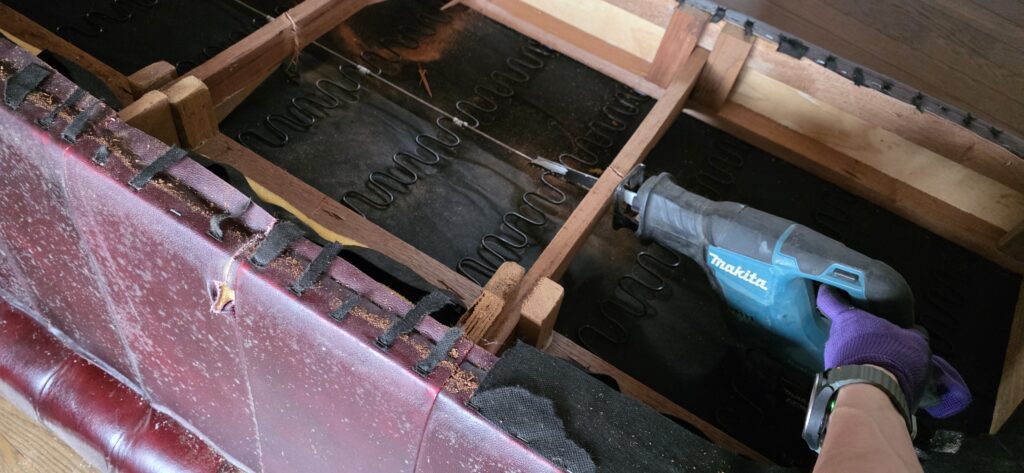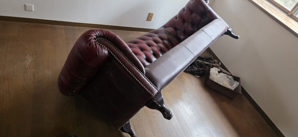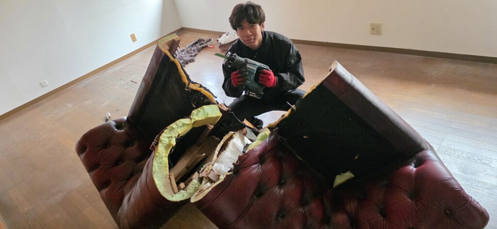 さらに2階には、過去に吊り上げで搬入したと思われる重厚な大型ソファーがあり、こちらも階段搬出が難しいサイズ感でした😈このようにセーバーソーで解体して階段で通るサイズにして搬出するのです😍