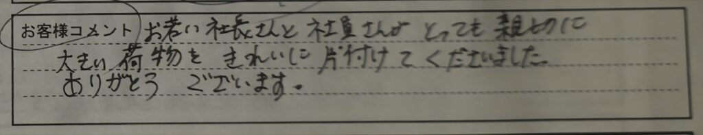 「お若い社長さんと社員さんが とても親切に 大きい荷物を きれいに片付けてくださいました ありがとうございます。」