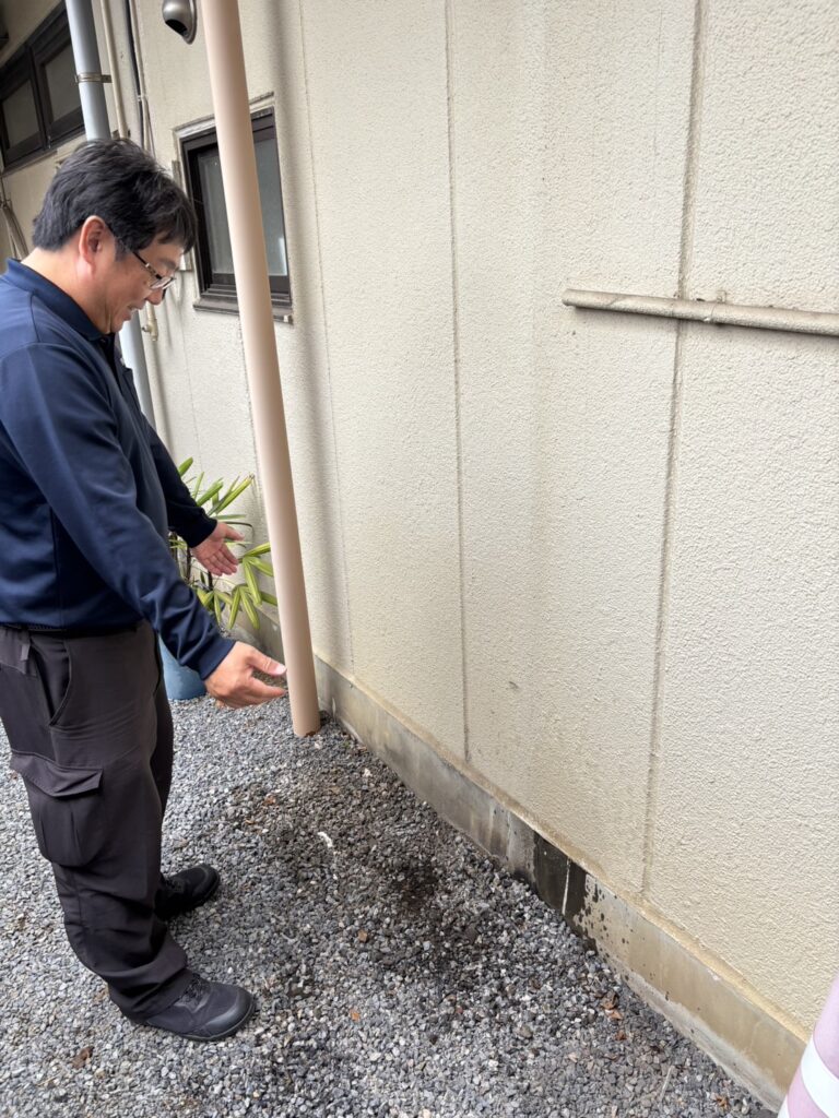 砂利敷きの裏手に室外機。配管カバーと電源ボックスの