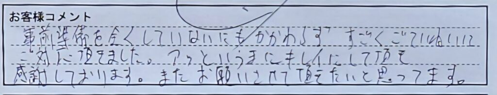 「事前準備を全くしていないにもかかわらず、すごくきれいに対応してくれました。 あっという間にきれいにして頂き感謝しております。 またお願いさせて頂きたいと思ってます。」